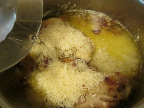 Next put in 150 g of rice with 300-350 ml of hot water into a cooking pot over medium heat.